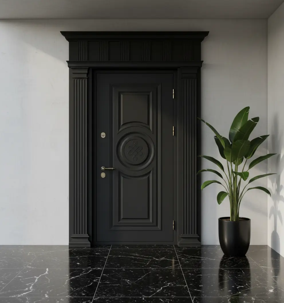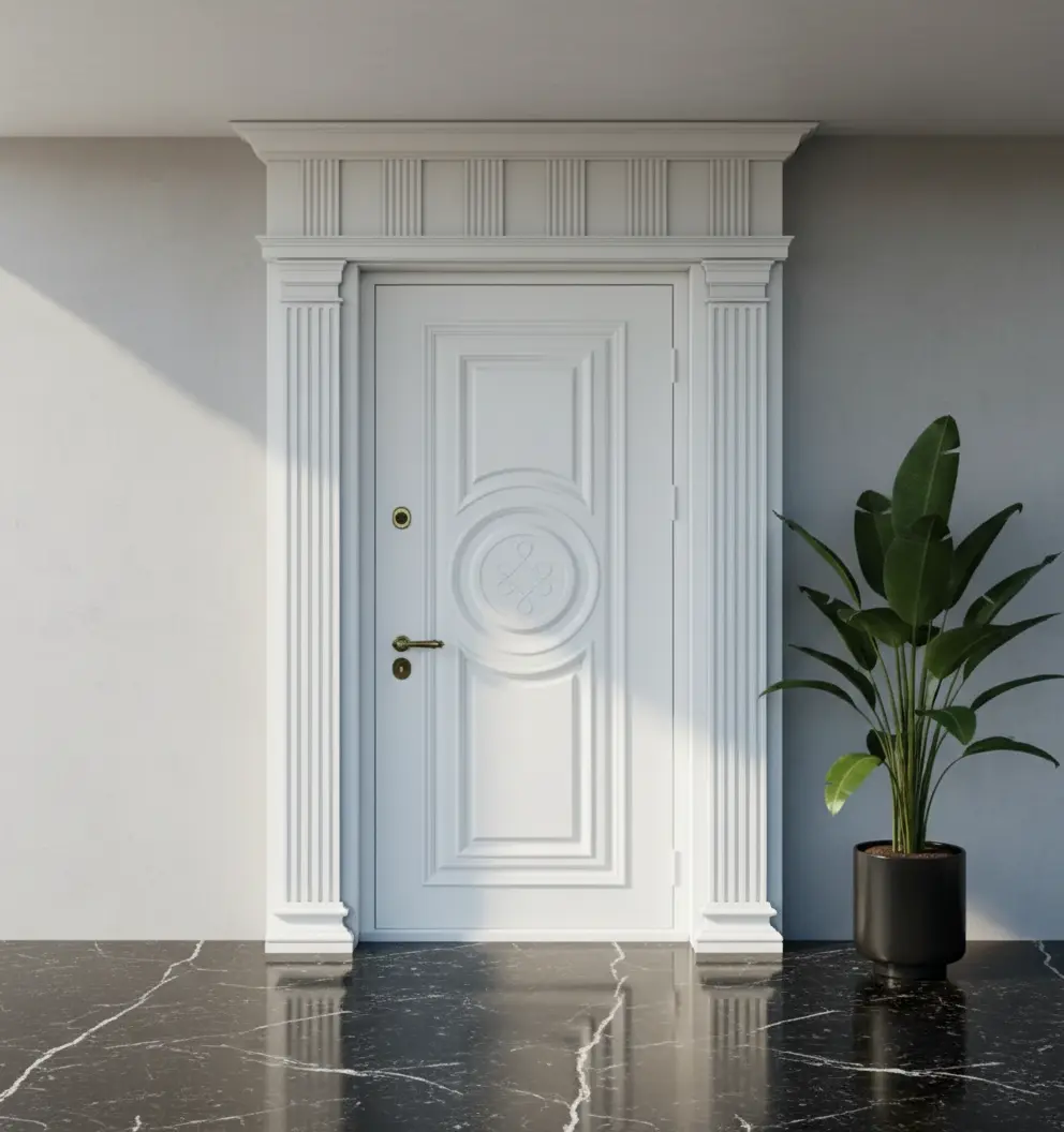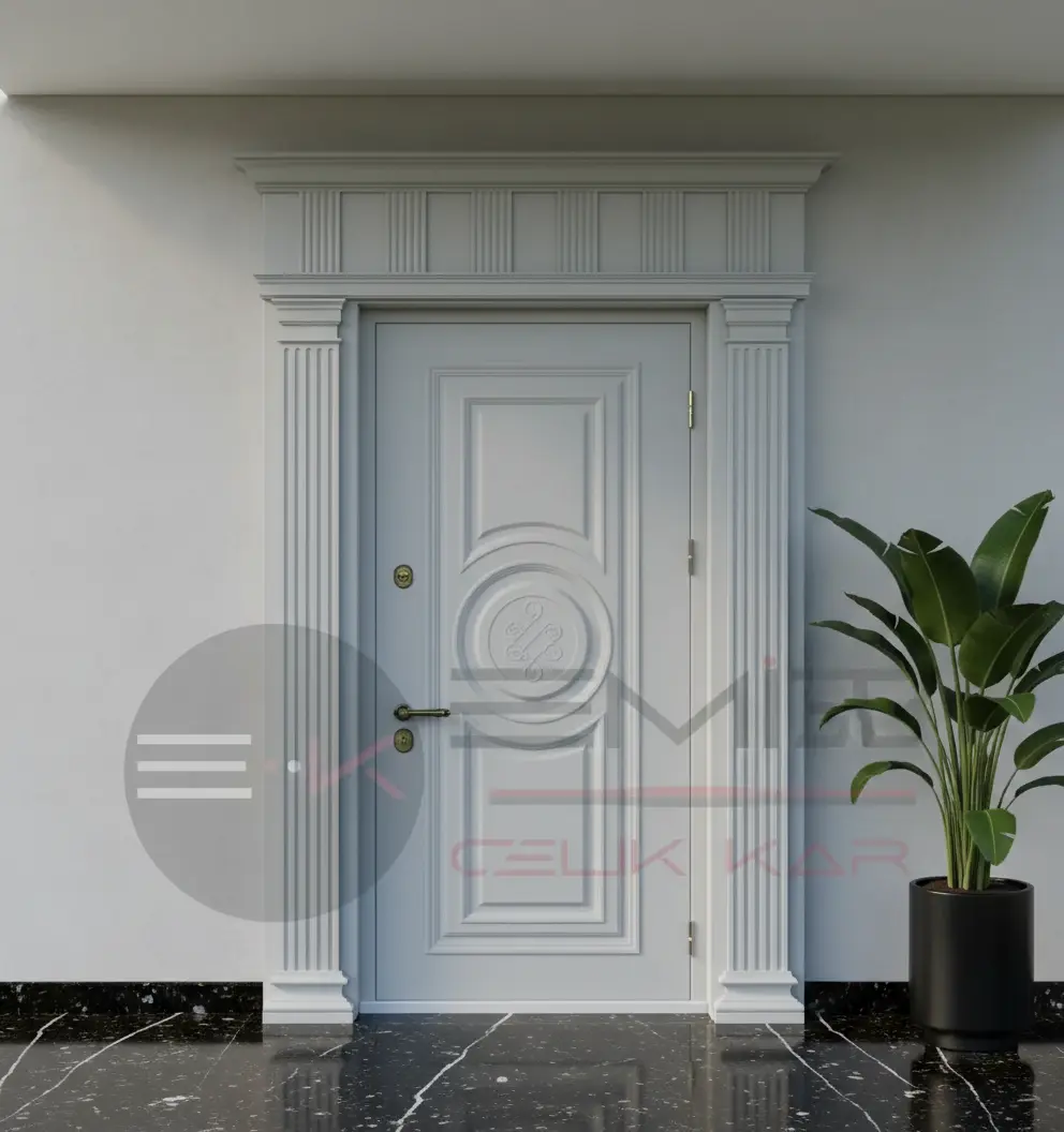 Kapı panellerinde kullanılan özel işlemeler ve sütun detayları, ustalıkla işlenmiş ahşap dokusuyla birleşerek sadece bir giriş kapısı olmaktan öte, villanızın prestijini artıran bir sanat eseri haline geliyor.