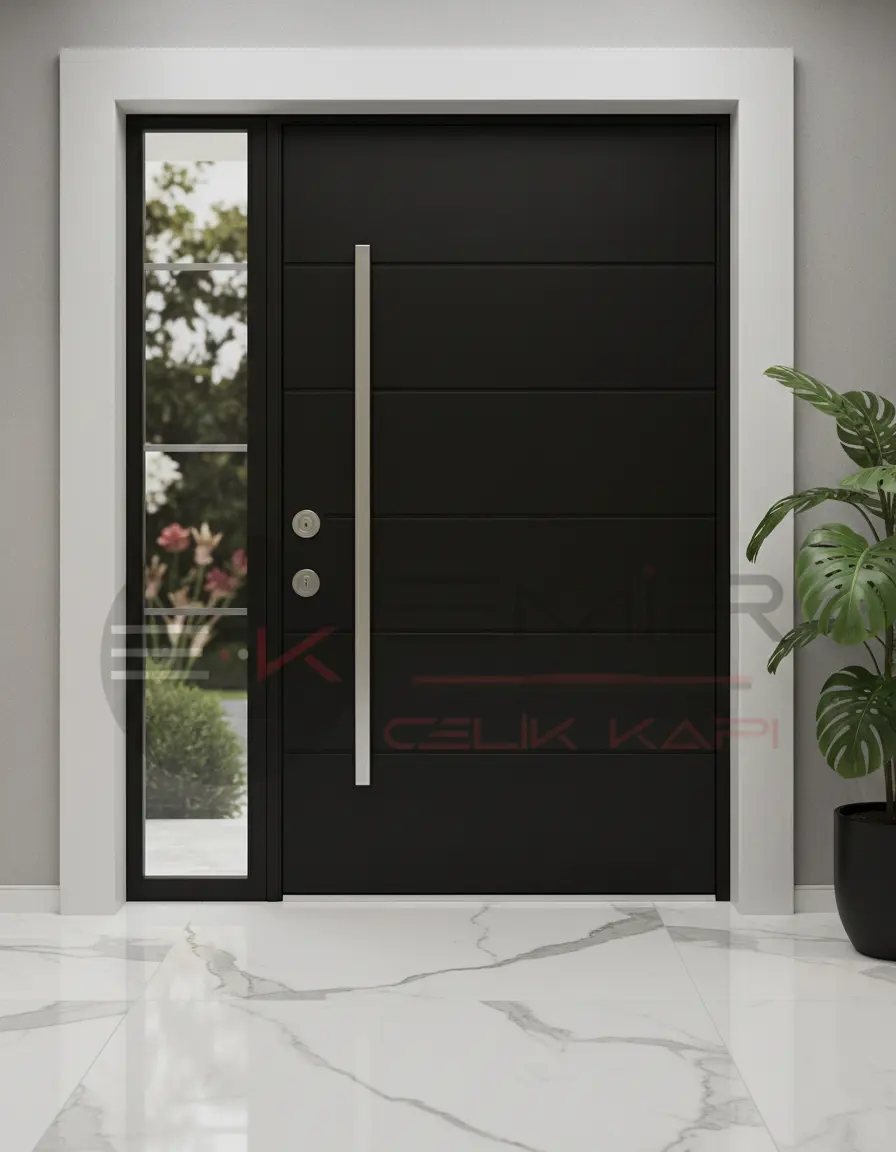 Arsenal modelinin yüzeyinde kullanılan özel kompozit malzeme, sadece estetik bir beyazlık sunmakla kalmaz, aynı zamanda pürüzsüz dokusuyla lüks villa kapısı algısını zirveye taşır. Gizli menteşe detayları ve zarif kol aksesuarı, kapının minimalist bütünlüğünü korur. Bu, Emir Çelik Kapı tasarım ekibinin, her detayı ne kadar ince düşündüğünün en net kanıtıdır.