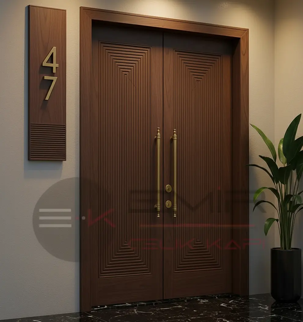 Ahşap kaplama villa kapısı modelleri kompozit ve kompak lamine ürünlerin aksine daha gösterişli kabartmalı modellerin yer aldığı ürünlerin yer aldığı ürün grubumuzdur. Ahşap kaplama villa giriş kapısı modelleri gösterişli zarif klasik mobilya tasarımlarına yer verilen çelik dış kapı modelleridir. Kapıların iç aksamı tüm ürün gruplarında aynı olmakla beraber ahşap kaplama villa kapısı modelleri yağmur ve güneşe kompozit ve kompakt lamine kaplama çelik villa kapıları kadar dayanımlı değildir, fakat doğal ahşabın kendine has dokusu ve eşsiz desenleri sayesinde sanat eseri kıvamında doğal ve göz alıcı kapı tasarımları seçenekler arasında muhakkak yer almalıdır.
