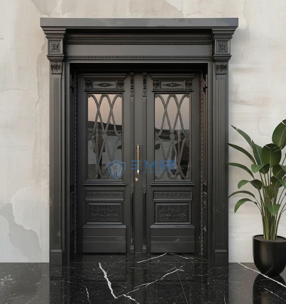 Görselde de gördüğünüz gibi, bu modelde estetik ve fonksiyonellik mükemmel bir dengeyle harmanlanmıştır. Geniş cam detayları, doğal ışığı içeri alırken, özel tasarım kol ve menteşeler de lüks bir görünüm sunar. Emir Çelik Kapı imzasıyla, bu model evinizin kimliğini yansıtan bir başyapıt haline gelir.
