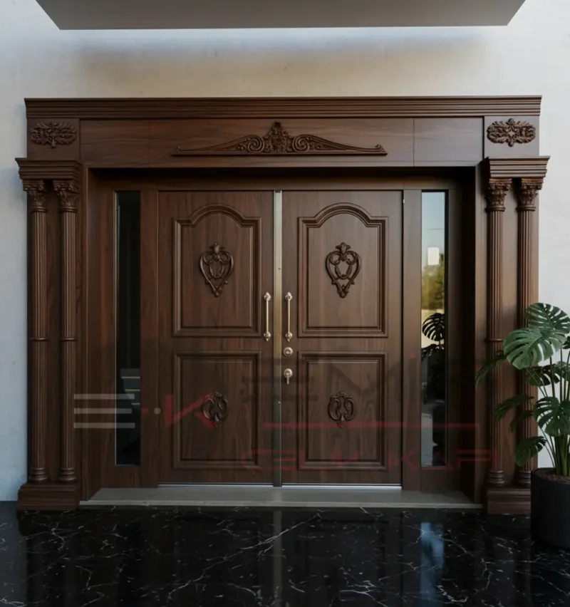 Ahşap kaplama villa kapısı modelleri kompozit ve kompak lamine ürünlerin aksine daha gösterişli kabartmalı modellerin yer aldığı ürünlerin yer aldığı ürün grubumuzdur. Ahşap kaplama villa giriş kapısı modelleri gösterişli zarif klasik mobilya tasarımlarına yer verilen çelik dış kapı modelleridir. Kapıların iç aksamı tüm ürün gruplarında aynı olmakla beraber ahşap kaplama villa kapısı modelleri yağmur ve güneşe kompozit ve kompakt lamine kaplama çelik villa kapıları kadar dayanımlı değildir, fakat doğal ahşabın kendine has dokusu ve eşsiz desenleri sayesinde sanat eseri kıvamında doğal ve göz alıcı kapı tasarımları seçenekler arasında muhakkak yer almalıdır.